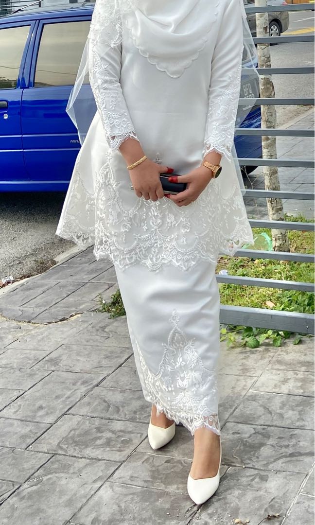Nikah Adnaa White Lace Baju Kurung Women S Fashion Muslimah Fashion Baju Kurung Sets On Carousell